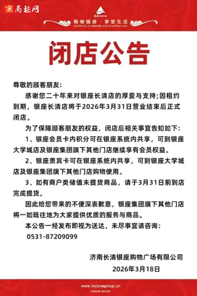 闭店公告!长清银座购物广场3月31日正式闭店!
