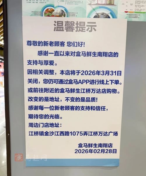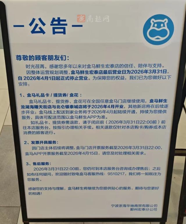 盒马鲜生宏泰店将于4月1日正式停止营业!