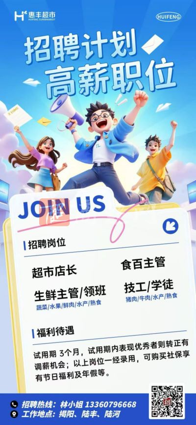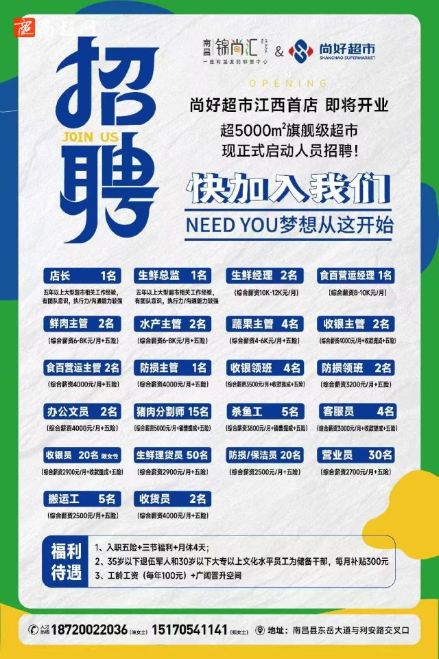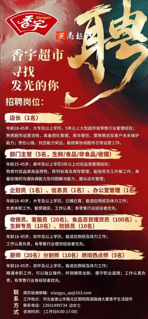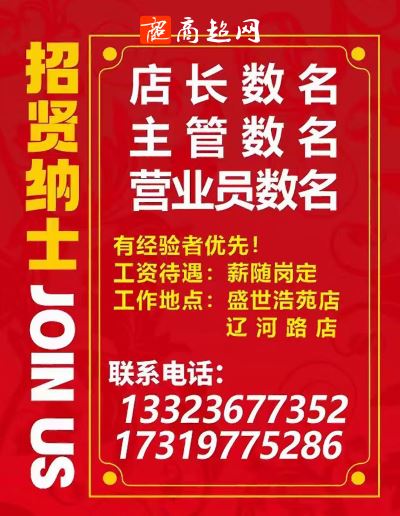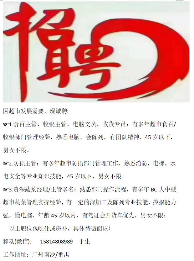 超市招聘 食品主管、收银员、生鲜主管、理货员,有意电话联系