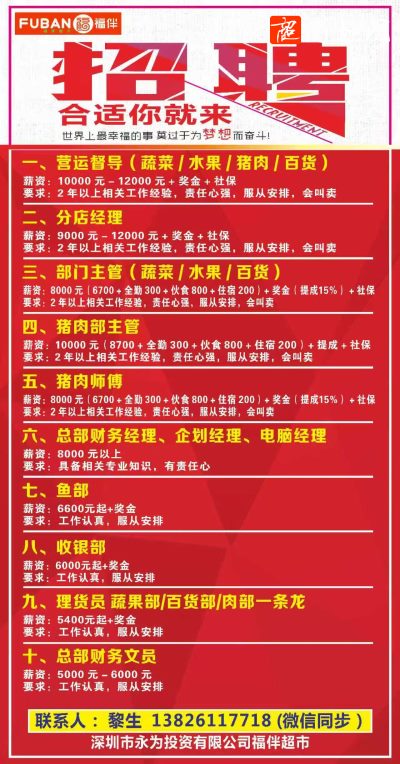 2000㎡中山连锁超市招聘店长等职位!