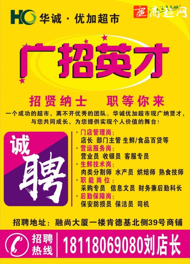 华诚优加超市招聘店长等职位!