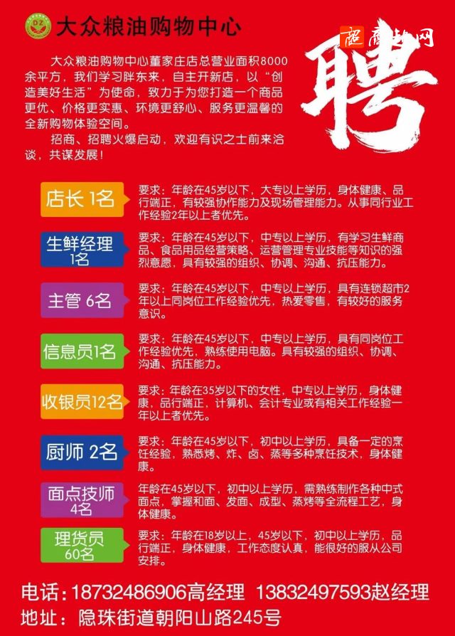 山东省青岛市大众粮油购物中心招聘店长等职位!