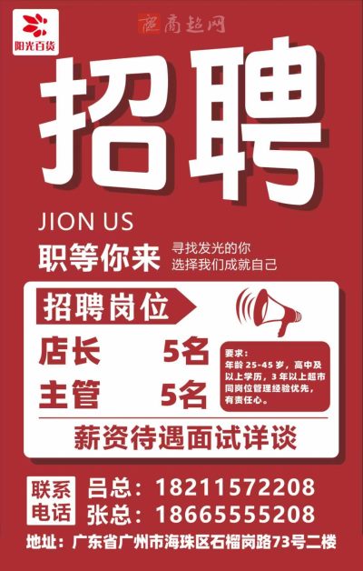 广西平乐县佰家汇购物广场招聘店长等职位!