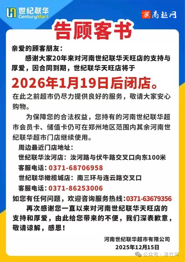 世纪华联超市公告:1月19日闭店!