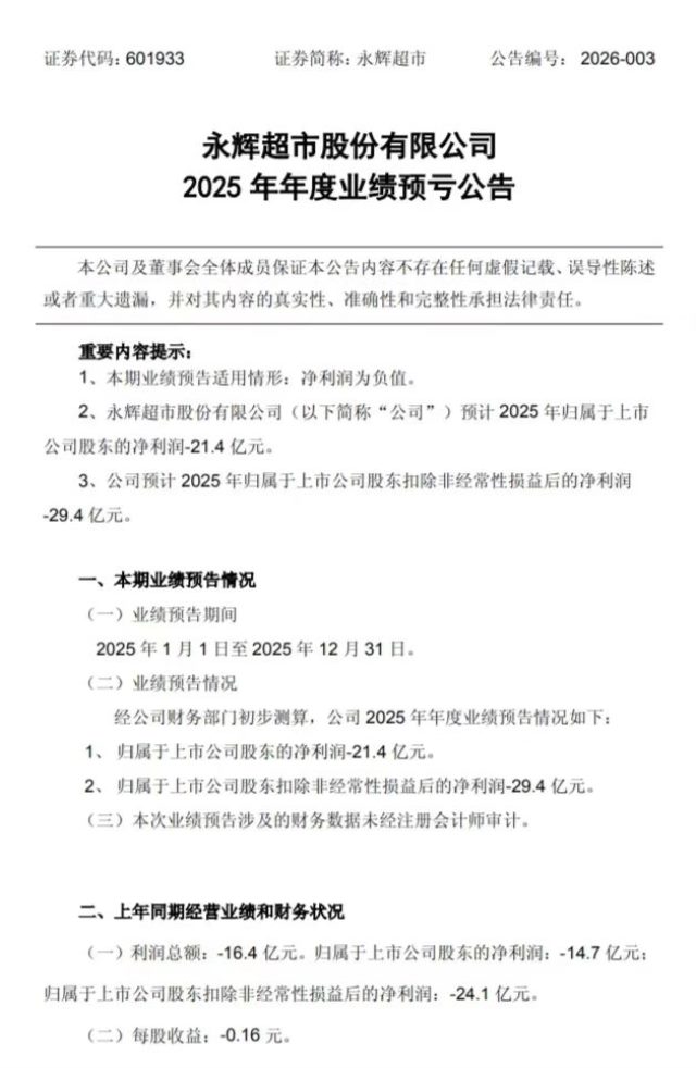 亏损29.4亿,永辉超市发布25年预亏公告!