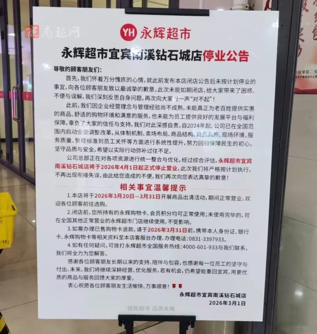永辉超市宜宾南溪钻石城店停业公告!