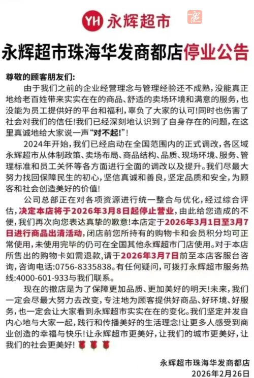 永辉超市珠海华发商都店停业公告!