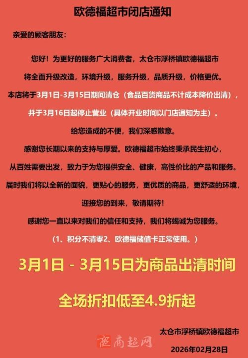 欧德福超市闭店通知!