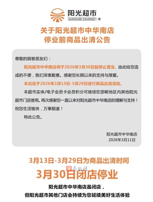 阳光超市中华南店停业出清公告!