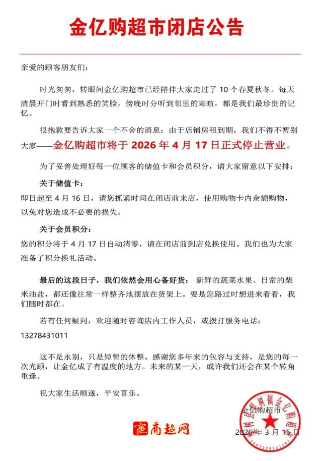 金亿购超市将于4月17日正式停止营业!