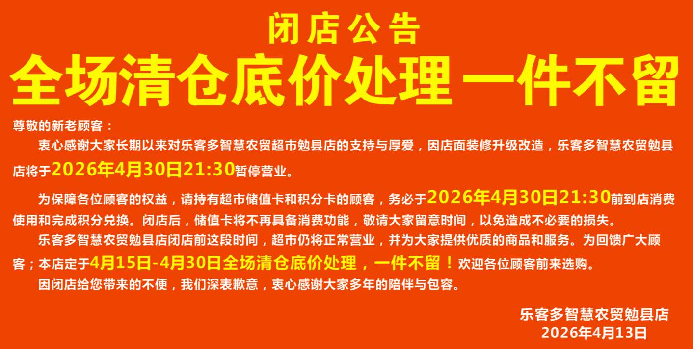 乐客多智慧农贸超市勉县店闭店公告!