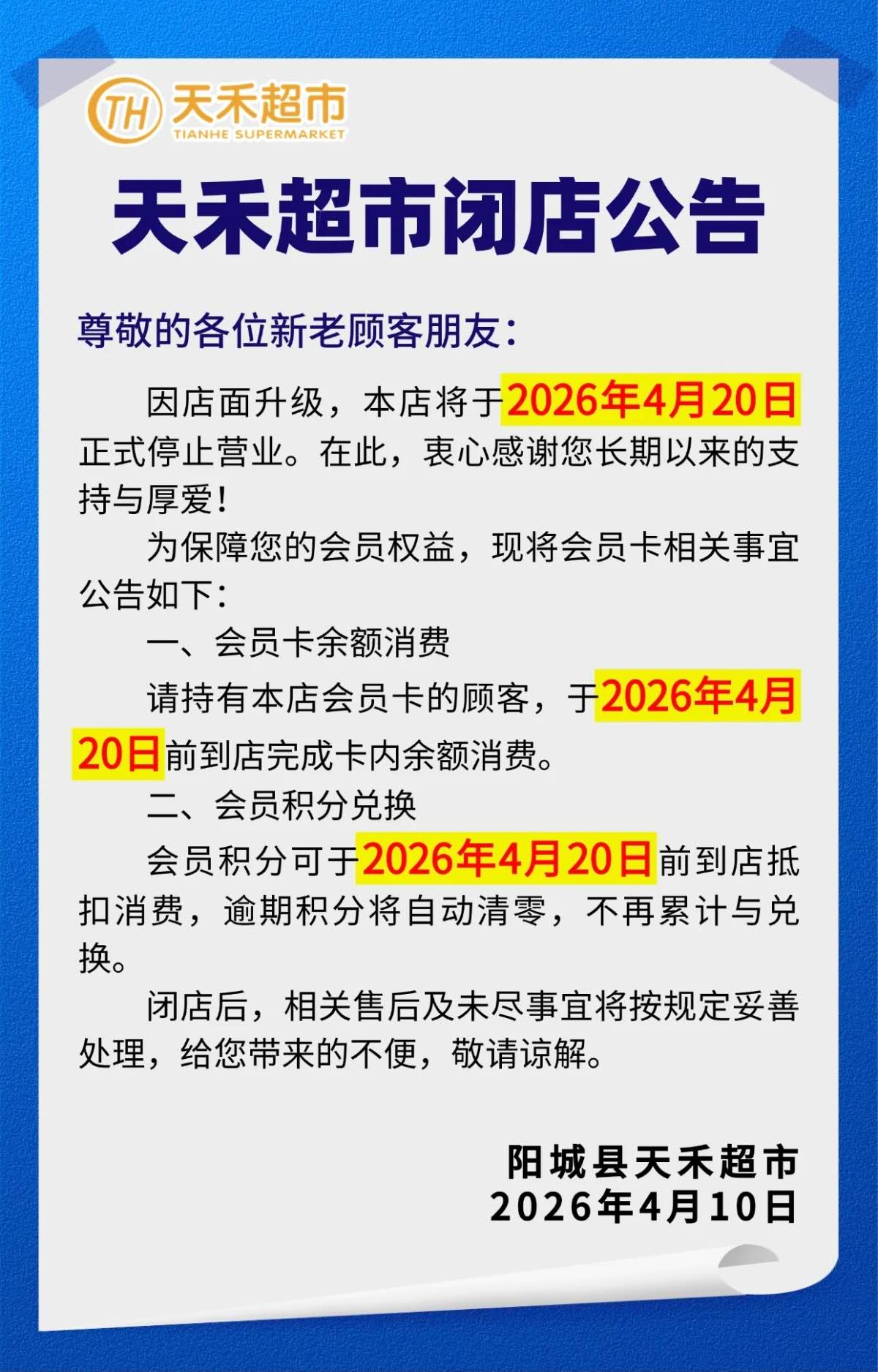 天禾超市闭店公告:4月20日正式停业!