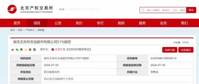 据乐居财经报道,7月5日,北京产权交易所项目,王府井集团股份有限公司拟挂牌转让南充王府井吉选超市有限公司(以下简称“南充王府井吉选超市”)51%股权。信息披露起止日期为2024年7月3日至2024年7月30日。