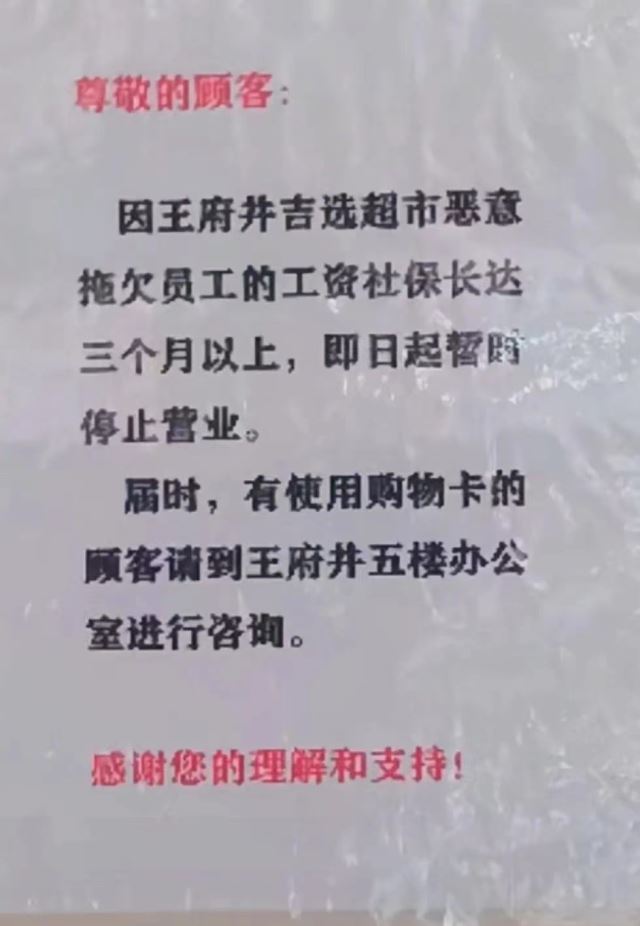 7月5日,网友拍摄到高坪区王府井购物中心负一楼的吉选超市已暂停营业。一纸公告显示:“因王府井吉选超市恶意拖欠员工工资社保长达三个月以上,即日起暂时停止营业。有使用购物卡的顾客请到王府井五楼办公室进行咨询。”