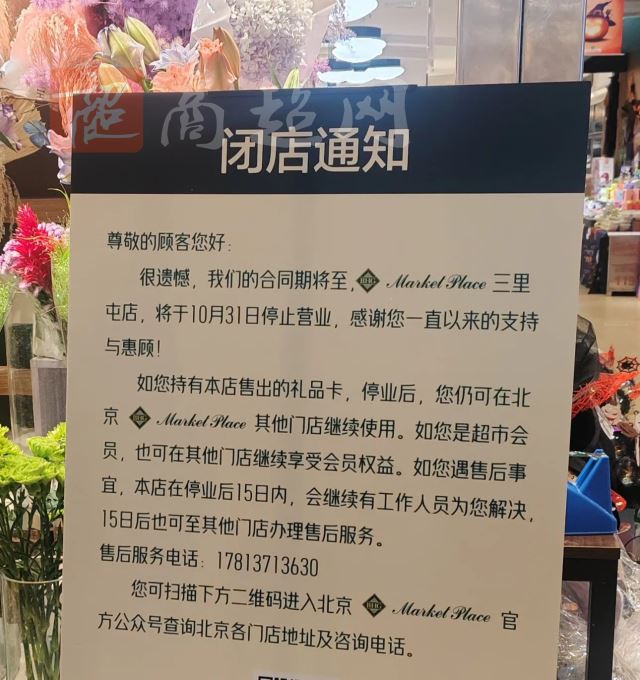 尊敬的顾客您好:很遗憾,我们的合同期将至,Market Place三里屯店,将于10月31日停止营业,感谢您一直以来的支持与惠顾!如您持有本店售出的礼品卡,停业后,您仍可在北京Market Place其他门店继续使用。如您是超市会员,也可在其他门店继续享受会员权益。如您遇售后事宜,本店在停业后15日内,会继续有工作人员为您解决,15日后也可至其他门店办理售后服务。