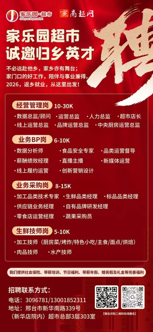 家家乐连锁超市招聘店长等职位!