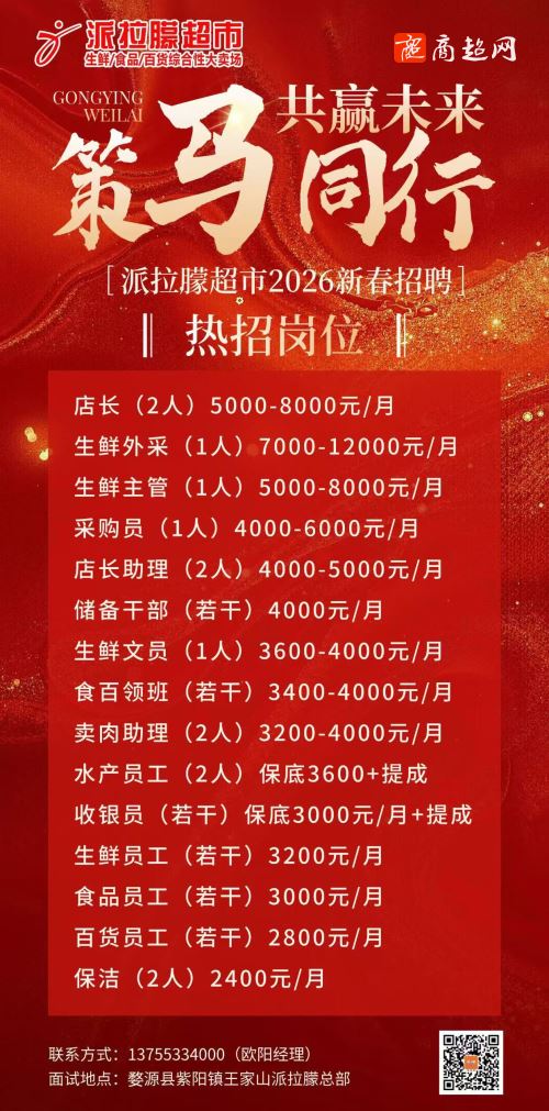 派拉朦超市招聘店长等职位!