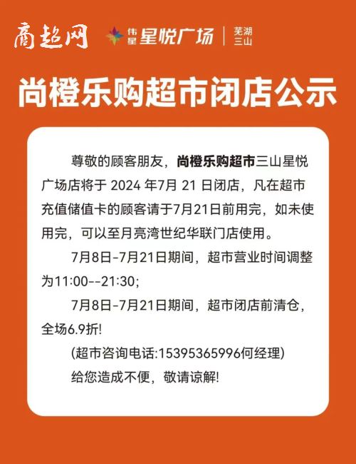 星悦广场尚橙乐购超市闭店公示,7月21日闭店!